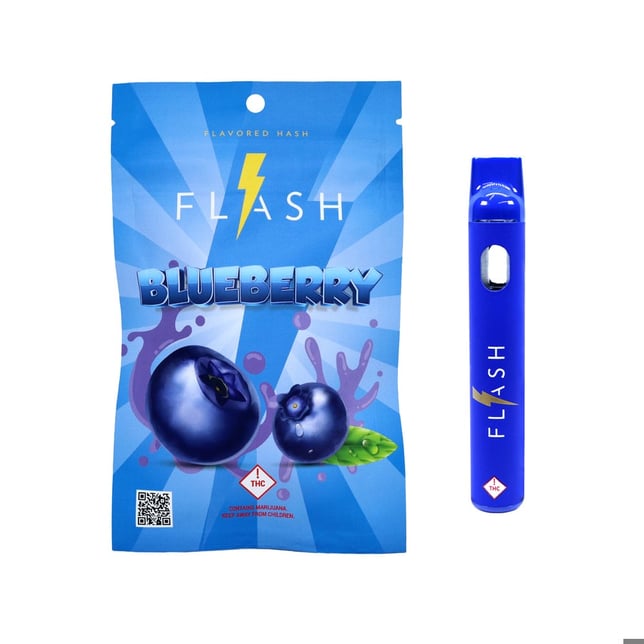 1g Blueberry. FLASH comes from FLAVORED HASH, and that’s exactly what it is. Pure, clean, and flavored with botanical terpenes, delivering a potent head punch high. Perfect if you love cannabis but not the “weed” flavor. The oil has been highly refined, and is water clear in soft-touch, all-in-one rechargeable hardware.