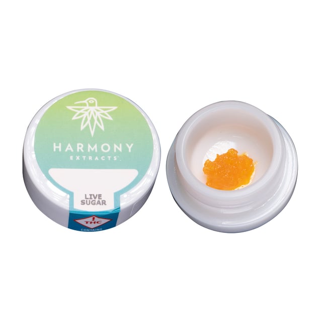 Harmony Hybrid Live Sugar consists of THCa crystals enveloped in rich terpene sauce delivering a customizable dab in an easy to use texture. Always from Harmony-grown, fresh-frozen flower, preserving the terpene profile of the live plant for consistent and delicious concentrates. Your budtender will ask for your strain preference.
