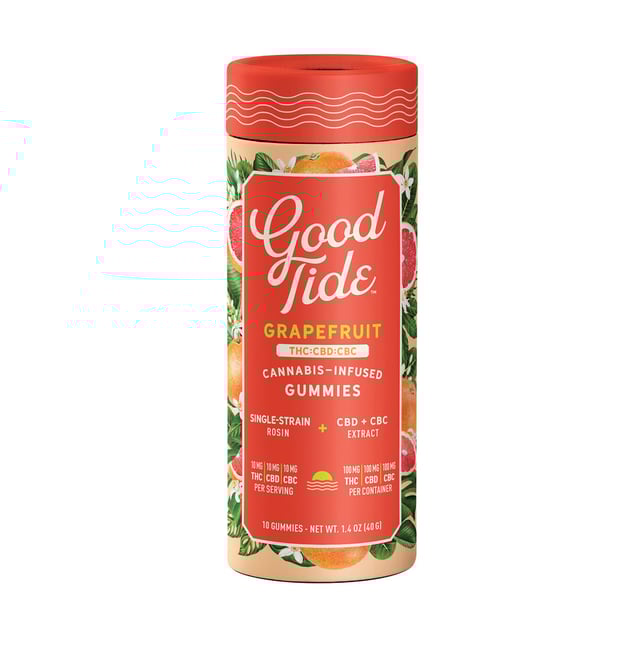 Good Tide Grapefruit THC:CBD:CBC gummies pair a Sativa single-strain rosin with the mood-boosting effects of CBC for citrusy, decadent treat that will get you a front row seat to bliss.