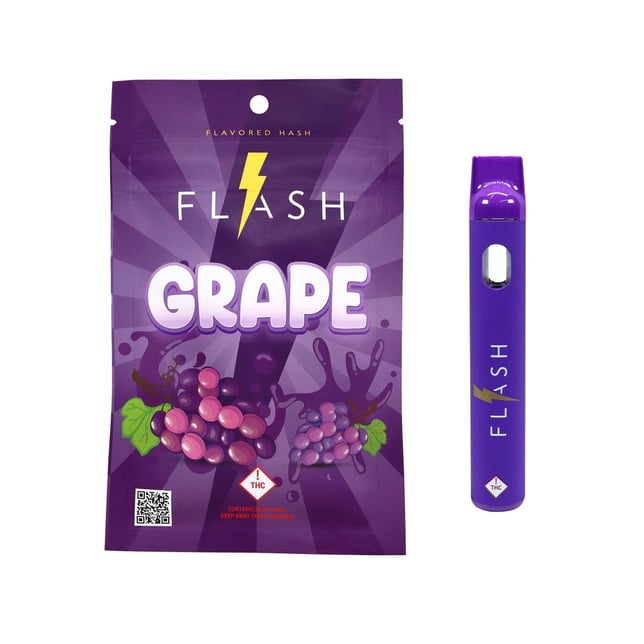1g Grape. FLASH comes from FLAVORED HASH, and that’s exactly what it is. Pure, clean, and flavored with botanical terpenes, delivering a potent head punch high. Perfect if you love cannabis but not the “weed” flavor. The oil has been highly refined, and is water clear in soft-touch, all-in-one rechargeable hardware.
