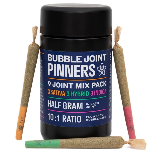 Bubble Joint™ Pinners are a "sessionable" version of The Flower Collective Bubble Joints, with half the amount of bubble hash and a slightly smaller size. Each jar contains 3 Sativa, 3 Hybrid and 3 Indica Bubble Joint™ Pinner products so you can experience them all.